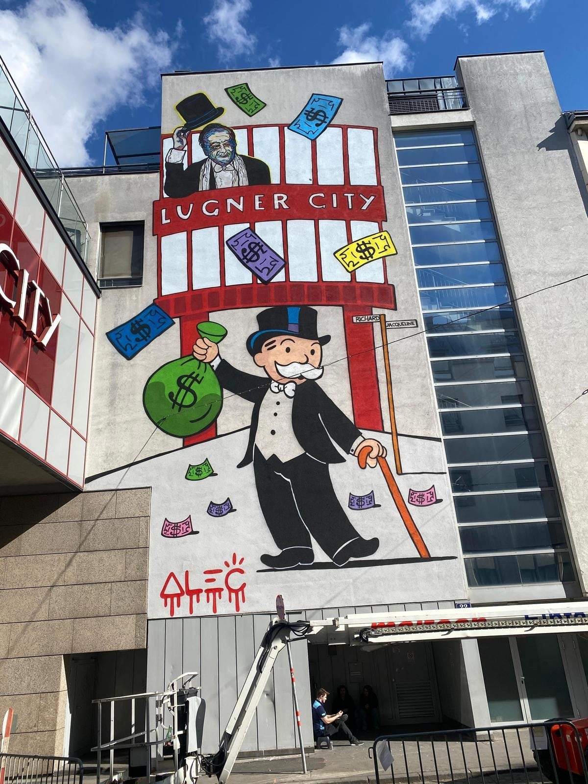 17 Meter hoch ziert das Graffiti von Street-Art-Star Alec Monopoly die Fassade der Lugner City. Doch was die Medien und Öffentlichkeit am Tag vor dem Opernball zu sehen bekamen, war nicht die Endversion der Mörtel-Würdigung. Diese wurde erst am Freitag nach dem Opernball fertiggestellt - und sieht Mega aus!