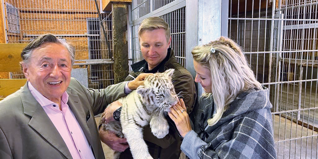 Alltag. Dass die „Tierchen“ gerne die Krallen ausfahren, ist Baumeister Richard Lugner (89) gewöhnt. Bei seiner neuesten Streichelzoo-Erfahrung im Kameltheater nahm das jedoch ungewohnte Dimensionen an. „Das kleine Tigerweibchen ist schon drei Monate alt. Sie kann ganz schön die Krallen ausfahren und auch zubeißen“, erzählt „Mörtel“. Gemeinsam mit „Bienchen“ Simone und „Bambi“ Nina Bruckner, sowie Simones Mama, flog er mit dem Helikopter erst Richtung Pogusch, dann eben in besagtes Kameltheater. „Es war schon lange geplant, dass wir mit meiner Fast-Schwiegermama zum Geburtstag die weißen Tiger anschauen gehen.“