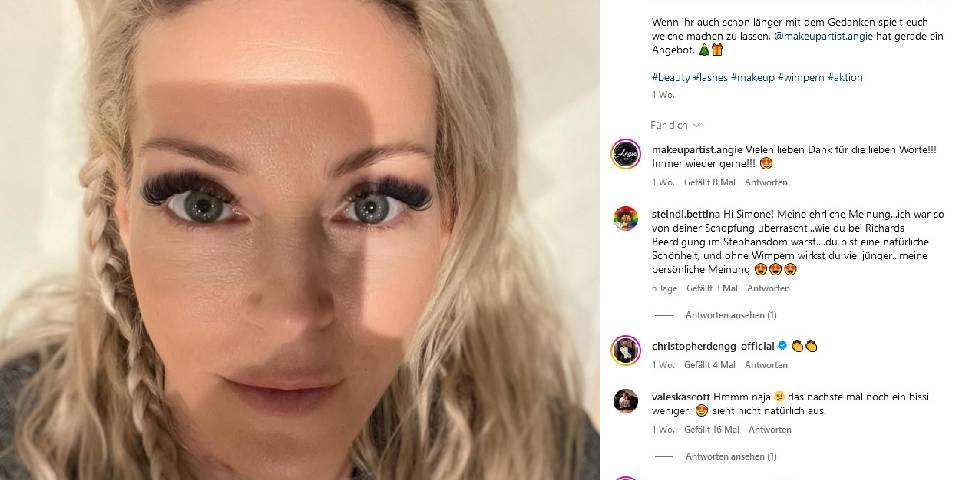 "Endlich seit Covid wieder meine ersten permanenten Wimpern vom Profi. Ich habe mittleres Volumen gewählt, halb natürlich sozusagen. Ein wenig Angst hatte ich, weil meine Augenlider seit damals mit extremer Schwellung auf die starken Kleber reagieren. Aber Angie hat eine sanfte Methode. Jetzt kann ich mindestens fünf Minuten länger schlafen jeden Tag", schreibt Simone Lugner zu einem Selfie, das sie mit den langen Wimpern zeigt.