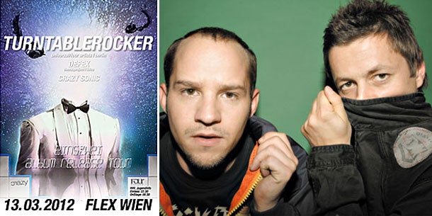 Turntablerocker sind ein deutsches DJ- und Clubmusik-Produzenten-Duo, bestehend aus Michael "Michi“ Beck von der Rap-Band Die Fantastischen Vier und Thomas "Thomilla“ Burchia. Als eine der ersten DJs und Produzenten haben sie Hip-Hop als Partymusik in der deutschen Clubkultur etabliert. Am 13. März kommen sie mir ihrem neuen Album „Eins,Zwei“ für einen Gast-Auftritt ins Wiener Flex. Für musikalischen Support sorgen DJ Defex und Crazy Sonic, die den Club bis in die frühen Morgenstunden zum Wummern bringen werden.