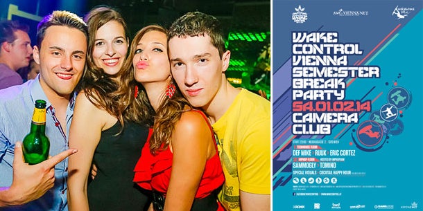 Zu Wake Control Vienna, dem größten Cable Wakeboard World Tour Veranstalter Österreichs, gehören mittlerweile auch die legendären Boarderparties im Camera Club zum Fixpunkt der Stadt. Damit man sich auf die Semesterferien so richtig einstimmen kann, lässt es Wake Control zur Semester Break Party am Samstag, den 1. Februar, ordentlich krachen.