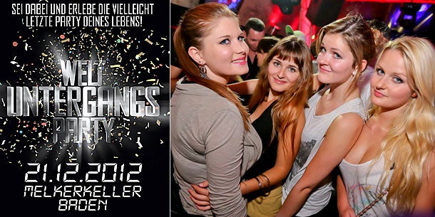 Am Freitag, 21.12 findet demnach die wahrscheinlich letzte Party des Lebens statt. Die Weltuntergangsparty im Melkerkeller Baden! Also lasst es krachen. Society24 verlost 2x2 Tickets für die Party!