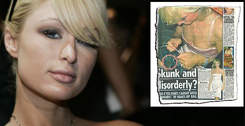 Ein Fotograf hat den Inhalt von Paris Hiltons Handtasche abgelichtet. Darin zu sehen: ein Säckchen mit grün-braunen Blättern...