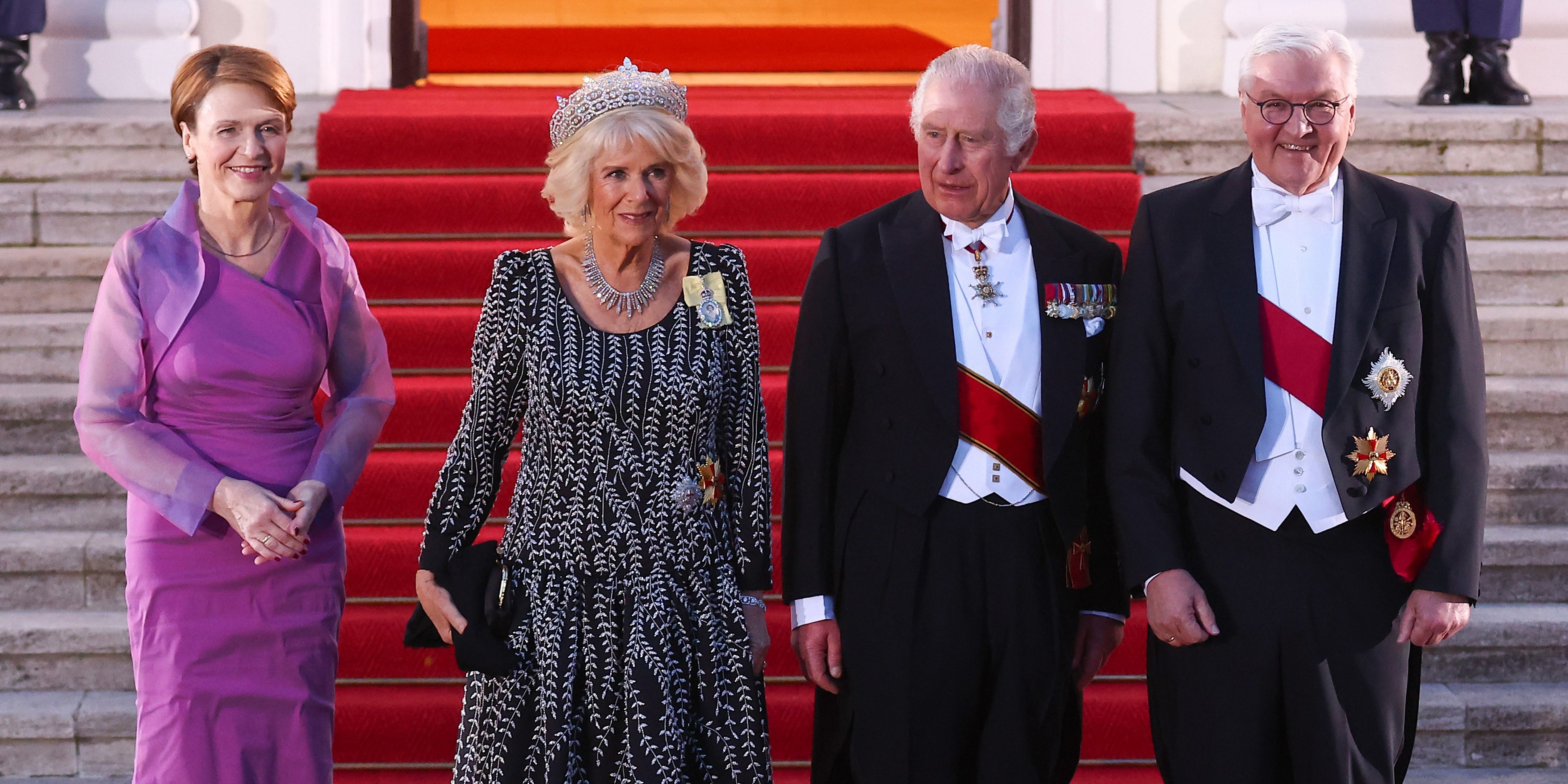 Charles und seine Frau Camilla waren am Nachmittag zu einem dreitägigen Staatsbesuch in Deutschland eingetroffen. Sie landeten am Flughafen BER und wurden mit 21 Schuss Salut empfangen. Als erste Staatsgäste überhaupt wurden sie anschließend in Berlin am Brandenburger Tor mit militärischen Ehren von ihren Gastgebern, Deutschlands Bundespräsident Frank-Walter Steinmeier und seiner Frau Elke Büdenbender, begrüßt - normalerweise findet dieses Zeremoniell am Amtssitz des Bundespräsidenten, dem Schloss Bellevue, statt.