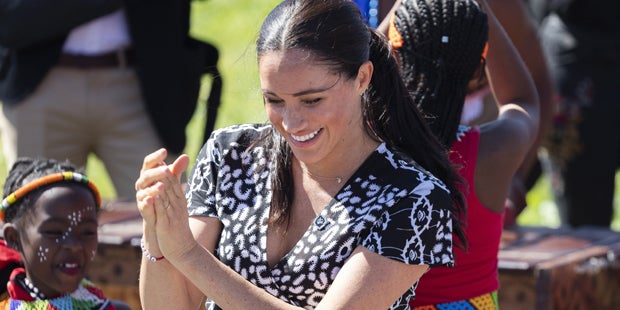 London/Kapstadt. Zu ihrer ersten offiziellen Reise als Familie sind der britische Prinz Harry und Herzogin Meghan mit dem rund vier Monate alten Archie in Kapstadt eingetroffen. Vor laufenden TV-Kameras herzte Meghan am Montag in einem Township-Projekt vor einem Reigen tanzender und trommelnder Jugendlicher einen kleinen Buben. Sie zeigte mit ihrem Kleid mehr Dekolleté, als bei den Royals sonst üblich ist.
