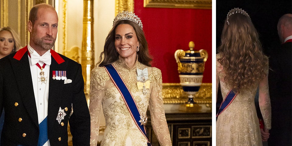 Prinzessin Kate, 43, trug ein cremefarbenes und goldfarbenes Spitzenkleid, während Prinz William, ebenfalls 43, einen klassischen schwarzen Anzug trug, der mit seinen militärischen Auszeichnungen verziert war. Kates Kleid wurde von Phillipa Lepley entworfen, und ihre Tiara, ein Lieblingsschmuckstück der verstorbenen Prinzessin Diana, ist laut Vogue als „Cambridge Lover’s Knot“ bekannt.