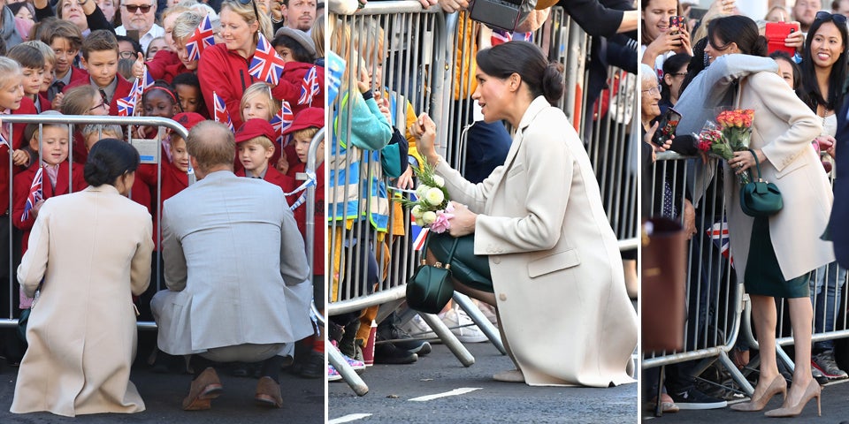 Spontan umarmte Meghan eine Frau, die sichtlich glücklich über diese Geste war! Danach hockten sich Meg und Harry sogar vor eine Gruppe Wartender hin. Die beiden machten quasi einen Kniefall; vor einem Haufen Kinder. Beide nahmen sich viel Zeit, um mit den Kleinen zu Quatschen. Meghans Kaschmir-Mantel, eine eierschalenfarbene Kreation aus dem Hause Armani, wurde dabei sogar dreckig.
