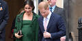 Sie unterhielten sich gut gelaunt mit Passanten und schüttelten unzählige Hände. Markle trug einen dunkelblauen zweireihigen Mantel. Harry kam ebenfalls im dunklen Mantel mit beigem Schal.