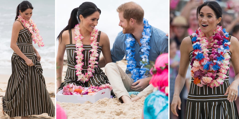 Barfuß und locker bekleidet haben der britische Prinz Harry und seine Frau Meghan bei ihrer Pazifik-Reise den berühmten Strand Bondi Beach in Sydney besucht. Das Blumenketten tragende Paar traf am Freitagmorgen Surfer und setzte sich mit Vertretern der Gruppe OneWave in den Sand.