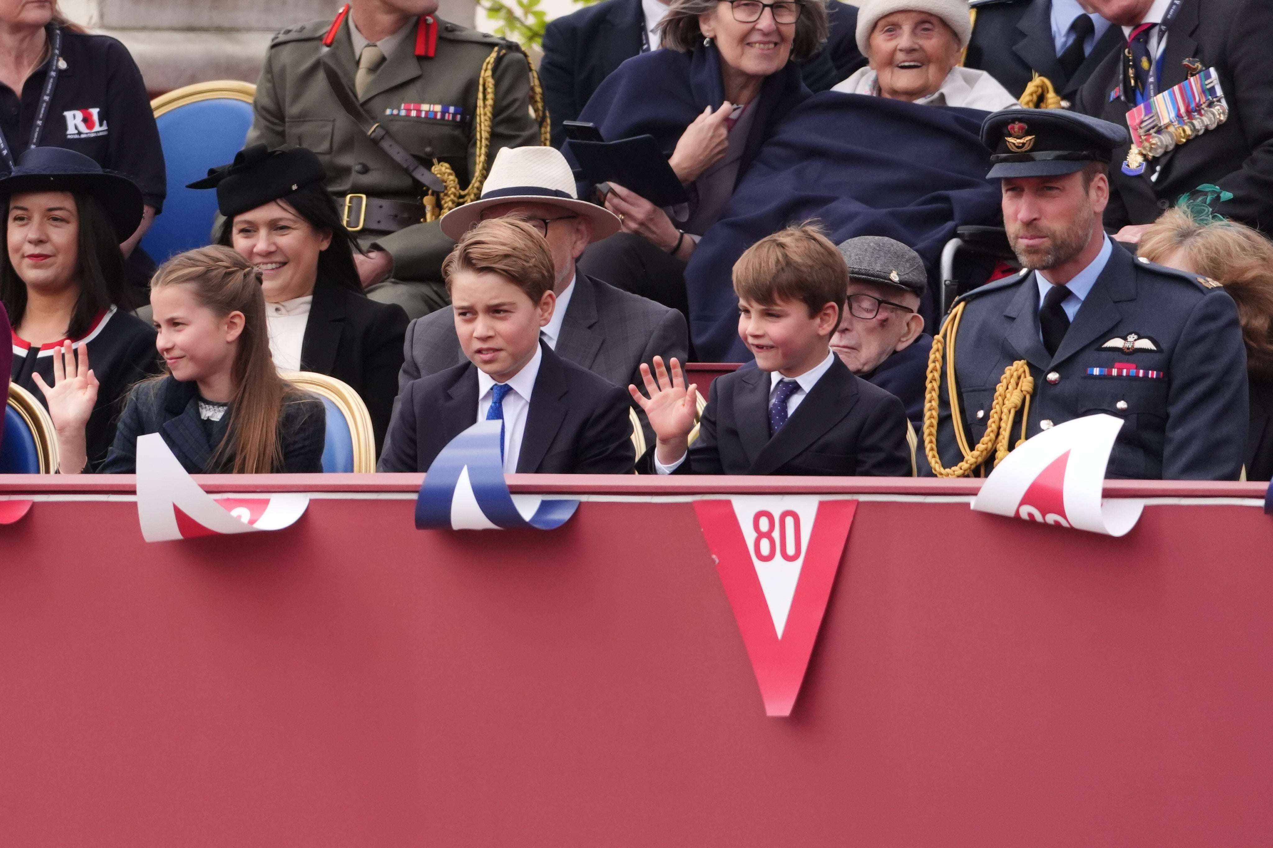Während sich Tausende Menschen vor dem Palast versammelten, um den offiziellen Gedenkveranstaltungen zum Ende des Zweiten Weltkriegs in Europa beizuwohnen, nahm die königliche Familie auf einem eigens errichteten Podest vor dem Queen Victoria Memorial Platz. Und wie so oft stahl der gerade einmal siebenjährige Prinz Louis dabei allen die Show.