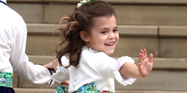 Nach der Trauung verließ sie gemeinsam die Kirche mit den anderen Blumenkindern die St. George Chapel in Windsor und stellte sich für Fotos auf die Treppe. Vor ihr gingen die Brauteltern Prinz Andrew und Herzogin Sarah „Fergie“ Ferguson.