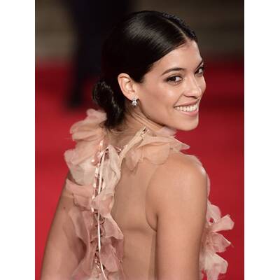 Herzogin Kate konnte mit den verführerischen Bond-Girls Monica Bellucci und Léa Seydoux in modischer Hinsicht mithalten. In ihrer zartblauen Chiffonrobe von Jenny Packham zog sie alle Blicke auf sich. Das Haar hatte sie zu einem eleganten Chignon frisiert, an der Taille glitzerte ein eleganter Strassgürtel.