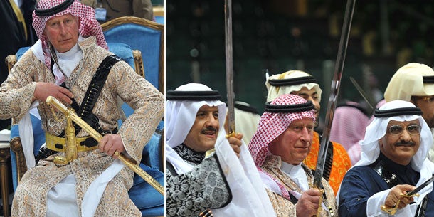 Der britische Thronfolger passt sich bei seiner Saudi-Arabien-Visite den örtlichen Traditionen an: Mit bestickter Robe, arabischem Kopfputz und einem goldenen Schwert hat sich Prinz Charles an einem Männertanz beteiligt. Gemeinsam mit mehreren Angehörigen der königlichen Familie schwang der britische Thronfolger bei der Eröffnung eines Folklorefestivals in Al-Darija bei Riad ein Schwert, das ihm seine Gastgeber zuvor geschenkt hatten.