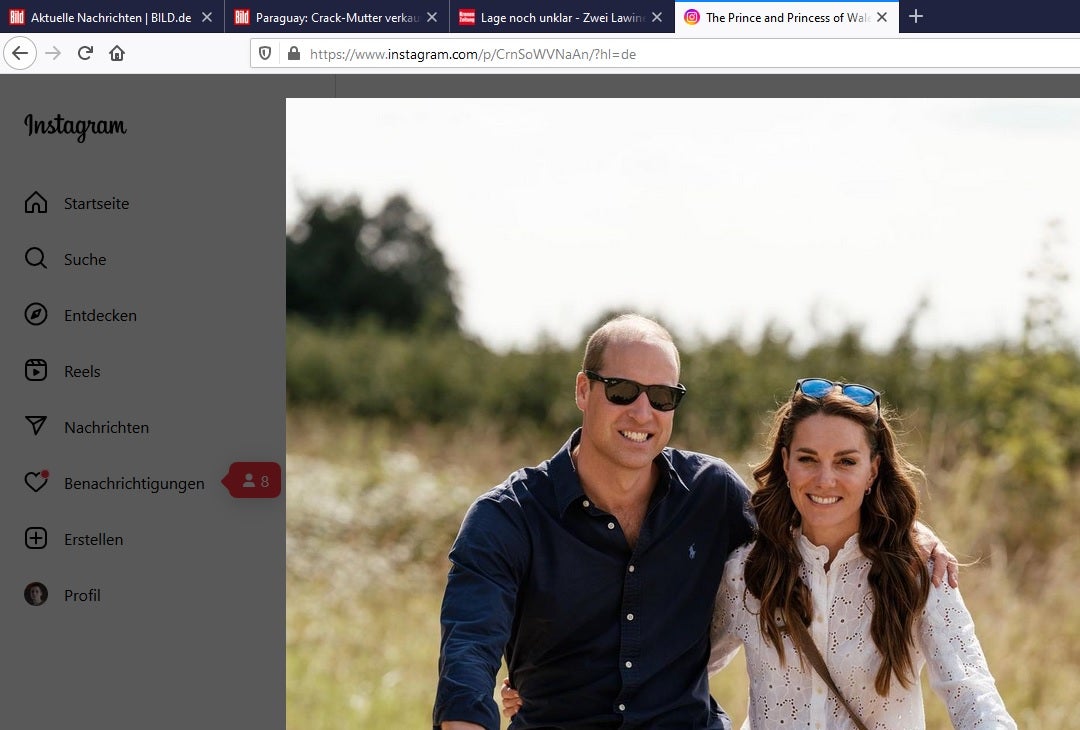 Die 41-jährige Kate hat ihre Sonnenbrille ins Haar gesteckt, zu einer weißen Bluse trägt sie blaue Jeans und eine braune Handtasche. William (40) trägt eine Sonnenbrille und hat die Ärmel seines blauen Poloshirts hochgekrempelt, der Kragen ist aufgeknöpft. Das Foto wurde vom offiziellen Fotografen des Paares, Matt Porteous, aufgenommen. Wo und wann es entstand, wurde zunächst nicht mitgeteilt.