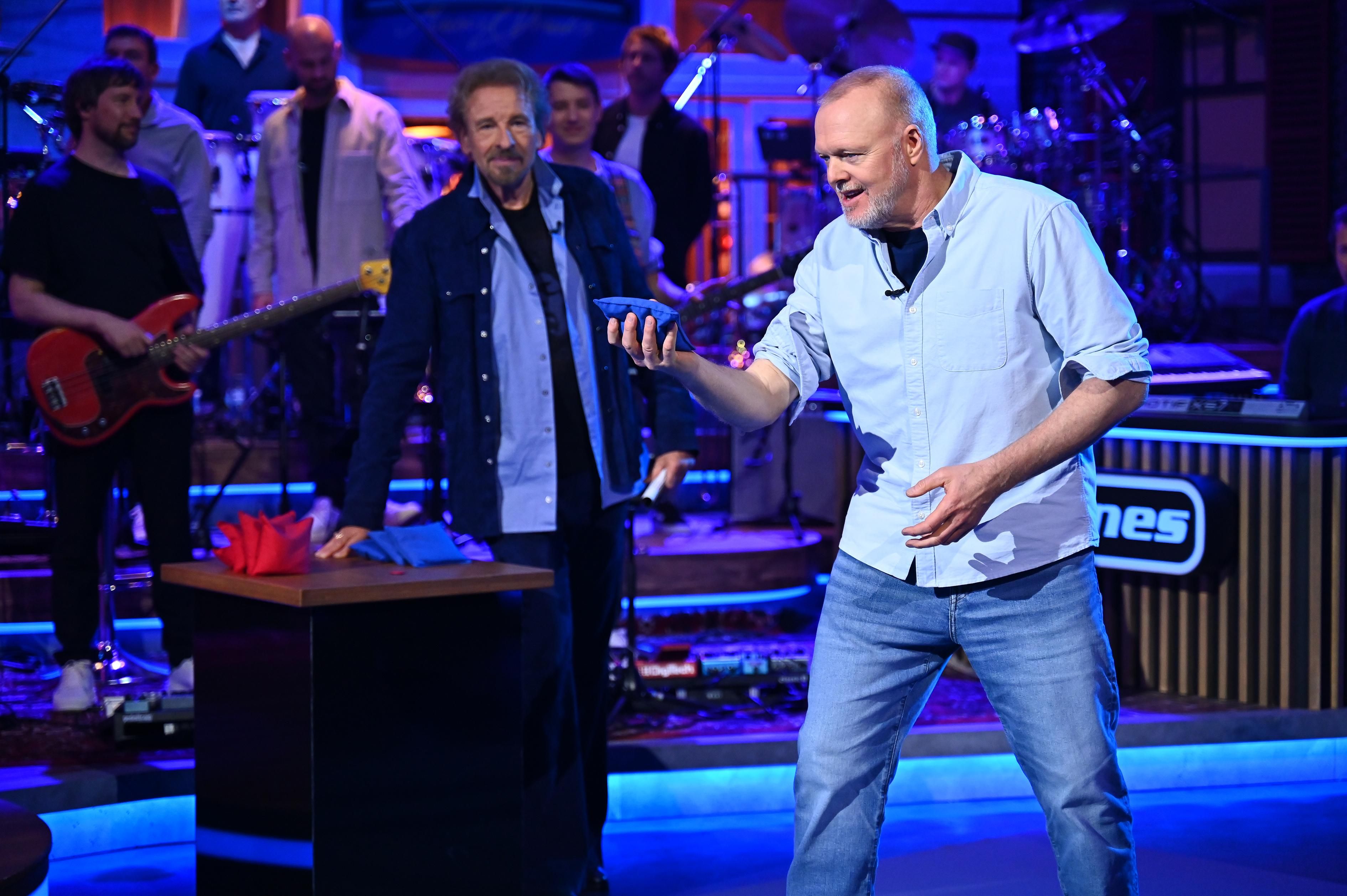 Stefan Raab war schon mehrmals bei Thomas Gottschalks früherem ZDF-Showklassiker "Wetten, dass..?" zu Gast - jetzt kam es zum ersten Gegenbesuch. Gottschalk trat als Gast in der am Mittwochabend veröffentlichten neuen Folge der RTL+-Streaming-Show "Du gewinnst hier nicht die Million bei Stefan Raab" auf. Er kam in Schlaghosen und bemerkte: "Was Klamotten betrifft, schlage ich Dich immer noch mit Leichtigkeit, Stefan. Aber dafür hast Du mehr Zähne als ich."