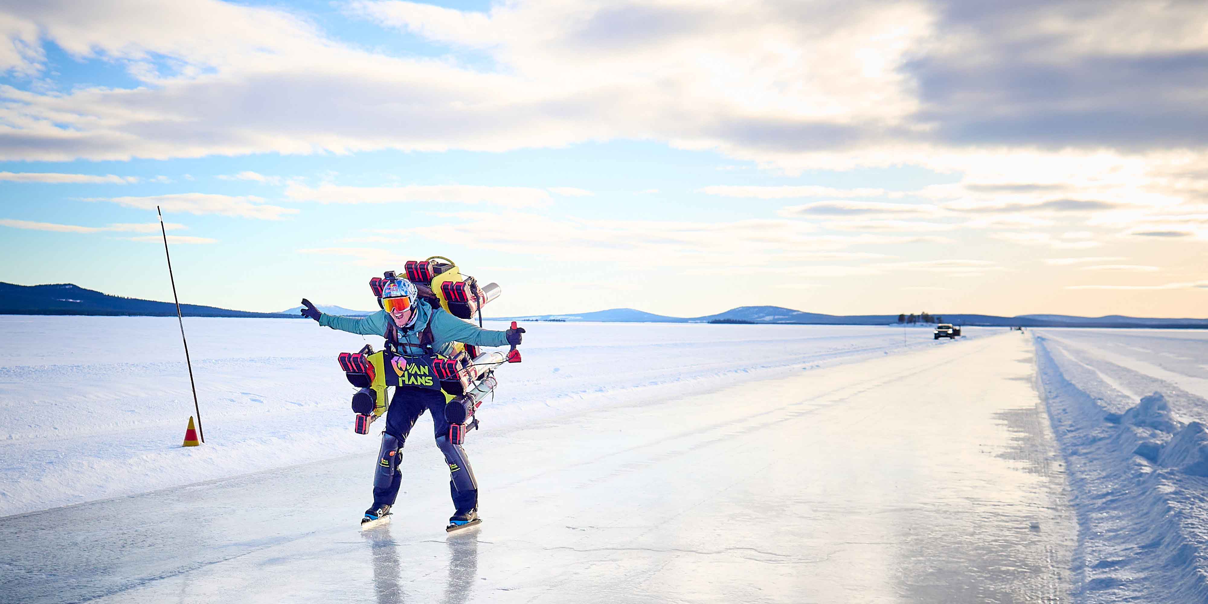 Ausgerüstet mit einem Exoskeleton und dem von der jungen DIY-Brand VANHANS eigens konstruierten Rocketsuit gelang es den beiden, angetrieben von zwölf Laubbläsern über das blanke Eis Lapplands zu rasen. Fazit nach insgesamt fünf rasanten Versuchen: Auf der 1,2 Kilometer langen und speziell präparierten Eispiste des 250 Quadratkilometer großen Uddjaure-Sees in Schweden konnte eine extra bereitgestellte Zeitmessung schlussendlich 74 km/h Spitzengeschwindigkeit ausweisen – das Ergebnis eines beispiellosen Zusammenspiels zwischen den Protagonisten und den Partnern von VANHANS und Einhell – wie Jack Wolfskin, Breitling, Comedes & POC Sports – mit denen man wochenlang an der perfekten Ausrüstung geschraubt und gebaut hatte.