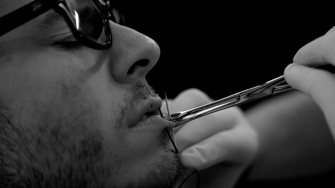 Um seine Kollektion im großen Stil zu präsentieren, wählte der 27-jährige Wiener eine extreme Methode: vor laufender Kamera wurde sein Mund zugenäht und die Präsentation seiner Kollektion schweigend durchgeführt.