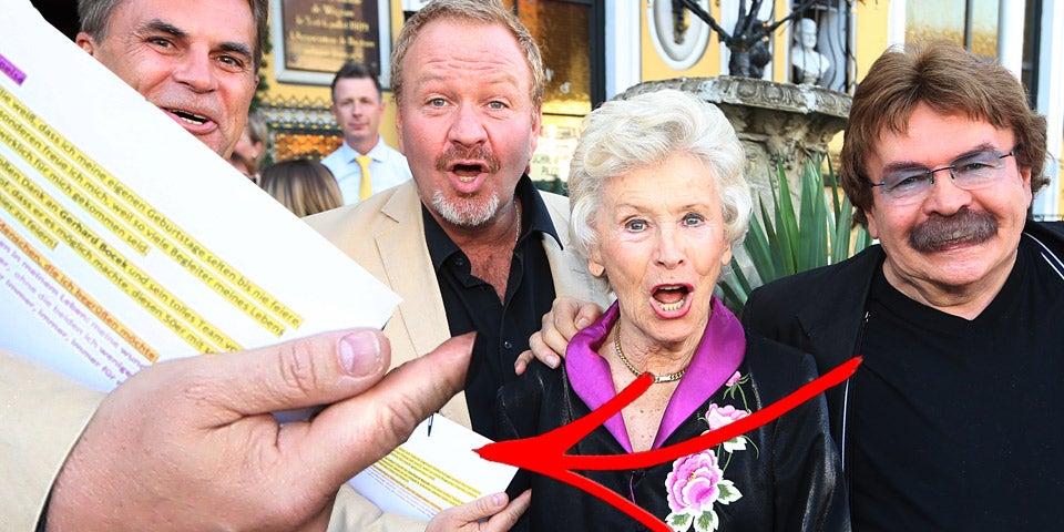 Aber schön der Reihe nach. Bevor die Geburtstagsgesellschaft so richtig zu feiern begann, posierte sie vor der Kamera von Kultfotograf Conny De Beauclair. Dabei dürfte Marcus Strahl entgangen sein, dass er das Manuskript für seine Geburtstagsansprache offen in der Hand hielt. Wie man weiß, lassen sich hochauflösende Fotos derart vergrößern, dass auch Kleingedrucktes zum Vorschein kommen kann. Was auf den Zettel stand, ist zwar nicht weiter spektakulär, aber dennoch bezeichnend: