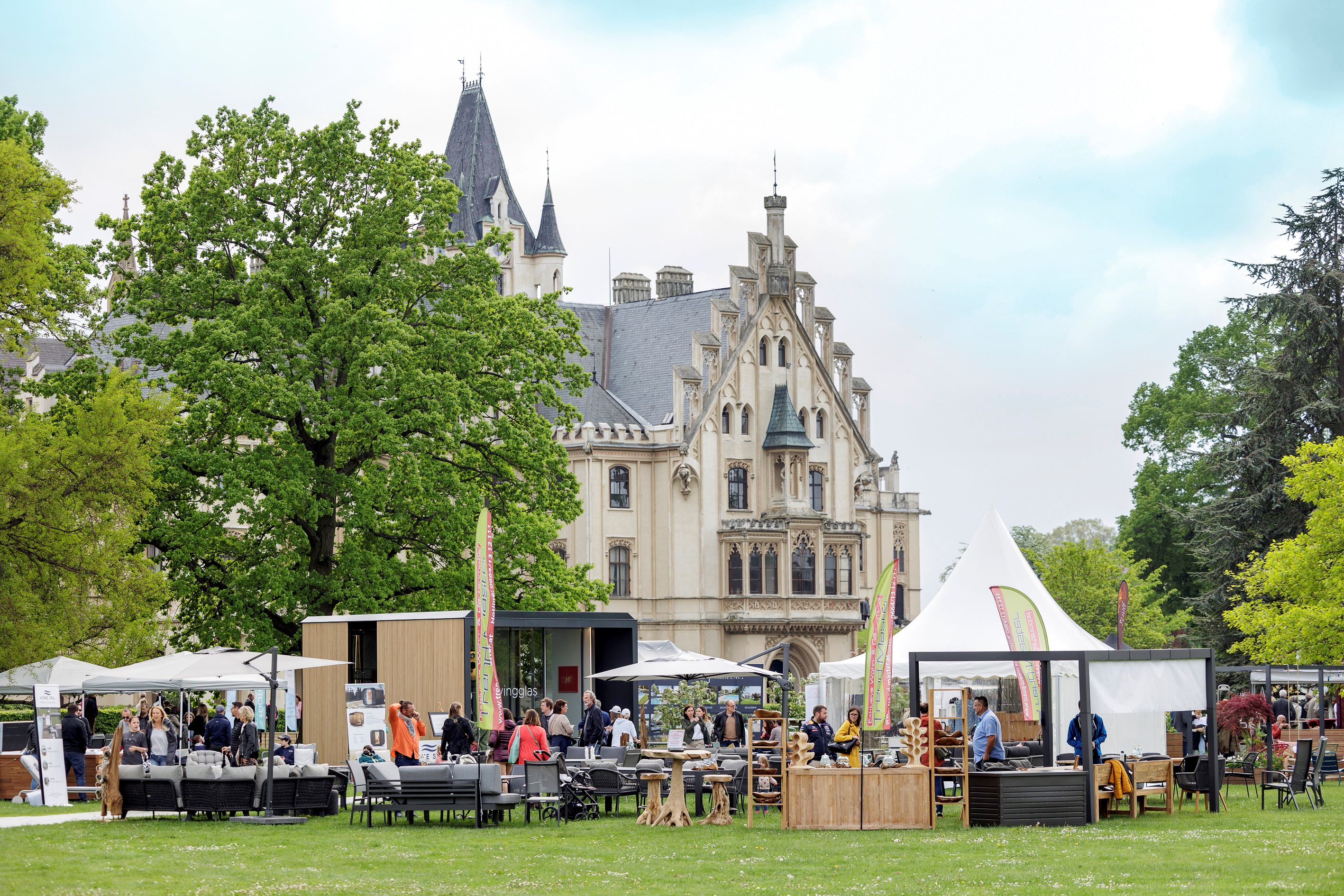Schon beim Betreten des gepflegten Schlossparks gibt es allerhand zu sehen. In dem großen Garten entstehen liebevolle Designlandschaften aus ausgewählten Möbelstücken für drinnen und draußen, die zum Probesitzen oder -liegen einladen. Es gibt prächtige Gartenarchitektur und Poolgestaltung zu entdecken, außergewöhnliche Wohn-Accessoires zu erstehen und lauschige Plätzchen, an denen man sich ausruhen kann.