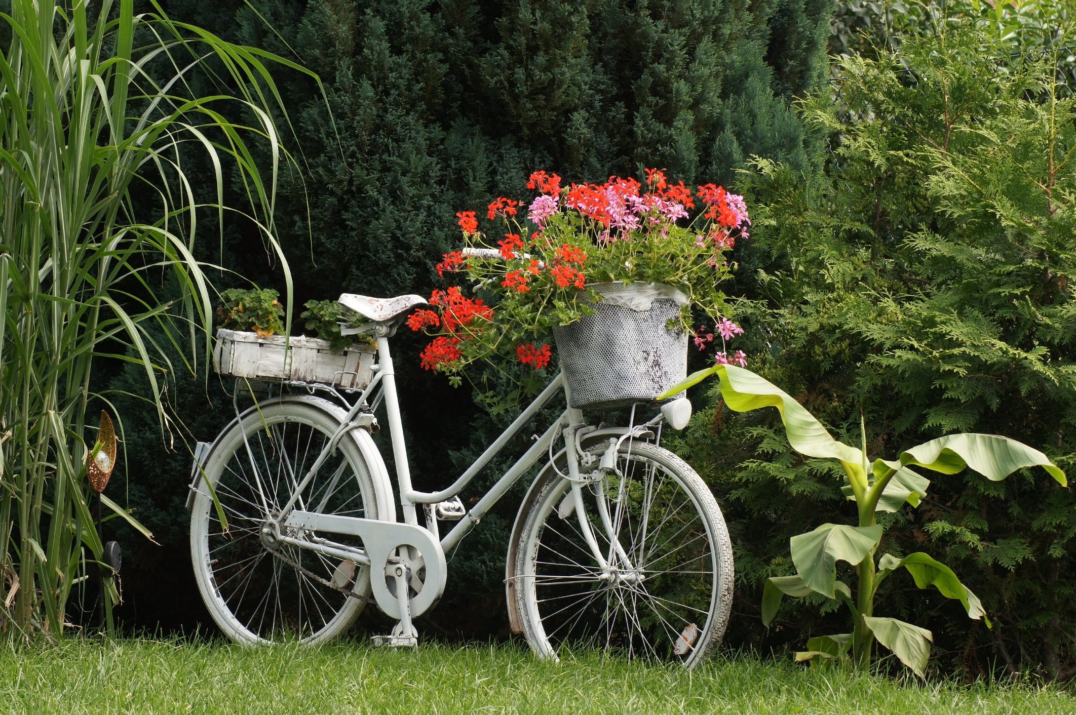 Pflanzen auf originelle Weise in Szene setzen gelingt auch mit ausrangierten Möbeln. Ein alter Sessel lässt sich zu einem Pflanzgefäß umfunktionieren, indem man die Sitzfläche entfernt und einen Blumenkübel einhängt. Auch Schubkarren sind leicht zu bepflanzen: Vor dem Befüllen mit Erde auf Abfluss-Löcher und eine Drainage-Schicht achten. Für diese Deko braucht es kein Geschick: Einfach sein altes Fahrrad mit einigen Blumentöpfen „upcyclen“.
