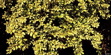Strahlendes Gelb liefert beispielsweise 'Golden Gem', eine Sorte der Japanischen Hülse (Ilex crenata), erläutert der Zentralverband Gartenbau in Bonn. Als breit ausladender, höchsten 80 Zentimeter hoher Strauch, fügt er sich mühelos in jeden Garten. Der gelbgrüne Spindelstrauch (Euonymus fortunei) 'Emerald 'n Gold' steht dem Ilex in der Farbwirkung kaum nach, obwohl seine Blätter zum breiten gelben Rand eine graugrüne Mitte tragen. Bei 'Goldqueen' ist die Farbverteilung umgekehrt, der dunkelgrüne Rand umgibt die sattgelbe Mitte.