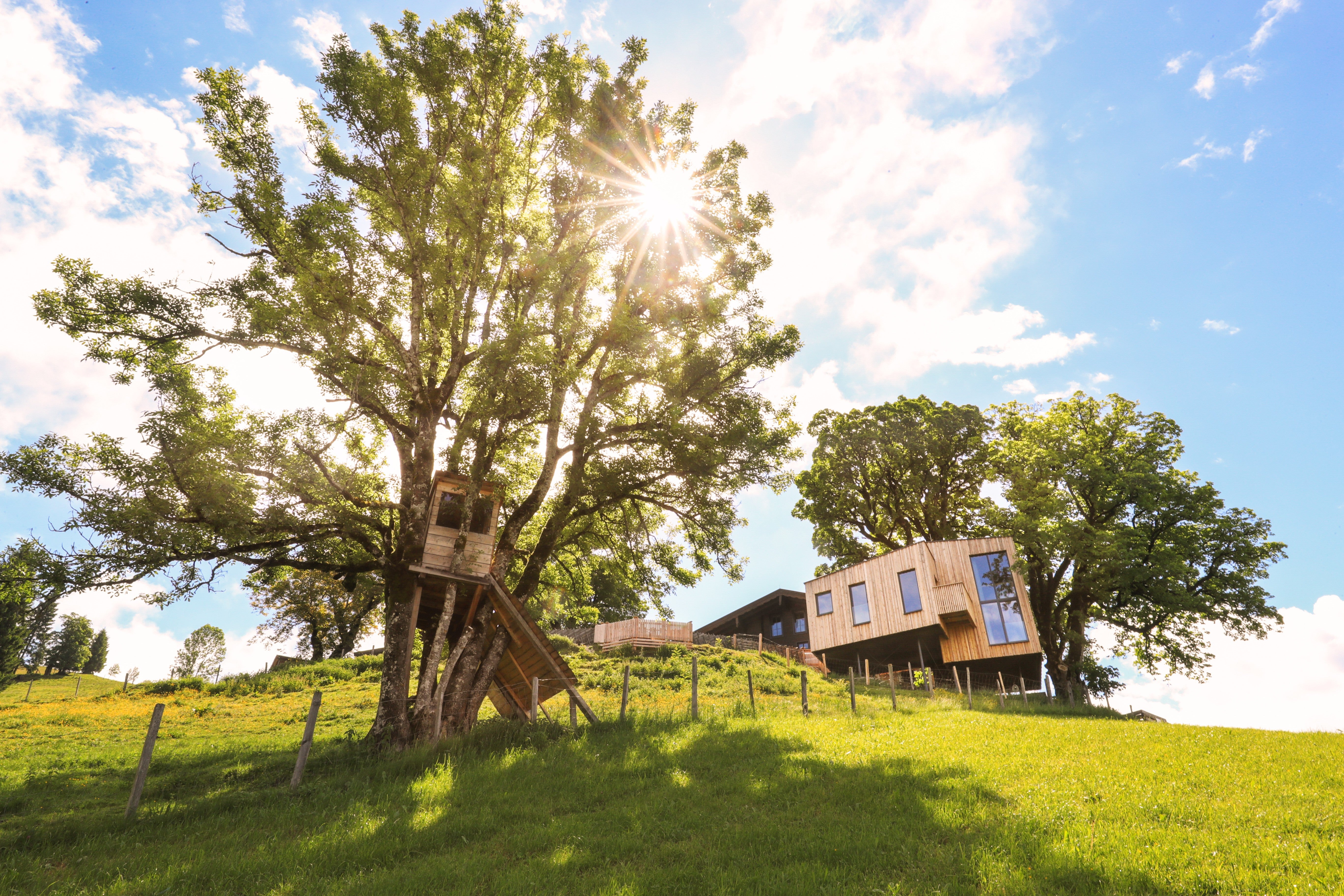 Die mächtigen Ahornbäume scheinen die Hauptakteure auf dem Taxbauerngut von Familie Unterberger zu sein. Naheliegend, die Bäume noch enger in das Leben einzubinden. Zuerst entstand ein kleines Baumhaus für die Kinder. Es kam bei den Erwachsenen so gut an, dass in den Ästen des Nachbarbaumes ein neues Baumhaus entstand. „Wir haben es wie eine Galerie angelegt“, verrät Katharina Unterberger, „unser neues Baumhaus wurde in die beiden Ahornbäume hineingesetzt, steht auf Stützen und ist zum Tal hin mit Fenstern versehen.“