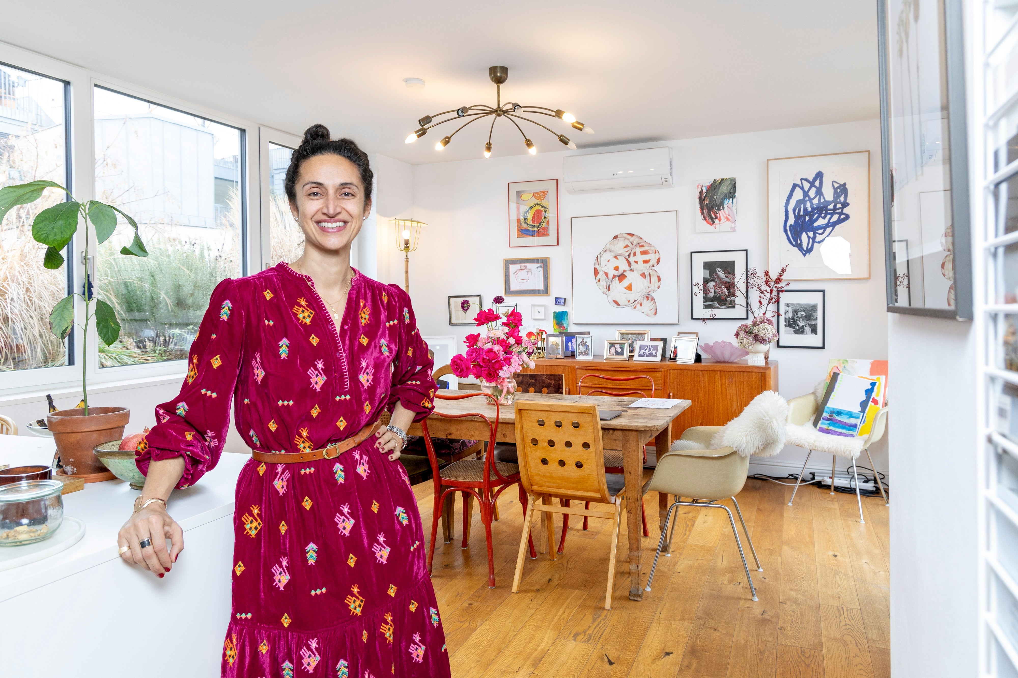 Aus mehreren Gründen hat sich die 47-jährige Mutter einer siebenjährigen Tochter zusammen mit ihrem Lebensgefährten in die rund 120 Quadratmeter große Wohnung samt Terrasse mit Blick über die Dächer des 2. Wiener Bezirks verliebt: „Obwohl ich eigentlich der Altbau-Typ bin, hat mich diese Wohnung sofort begeistert“, erzählt die Eventmanagerin. „Die Ruhe, die Helligkeit und vor allem der große Wohn-, Ess- und Küchenbereich im Obergeschoß, der mich an ein Schiffsdeck erinnert, haben mich überzeugt.“ Seit sechs Jahren lebt – und arbeitet – die Familie hier. Denn auch, wenn „yamyam event Production“ in der Hollandstraße, wenige Gehminuten von Maryams Wohntraum entfernt, ein eigenes Büro hat, werkt die Agenturchefin freilich auch zu Hause.