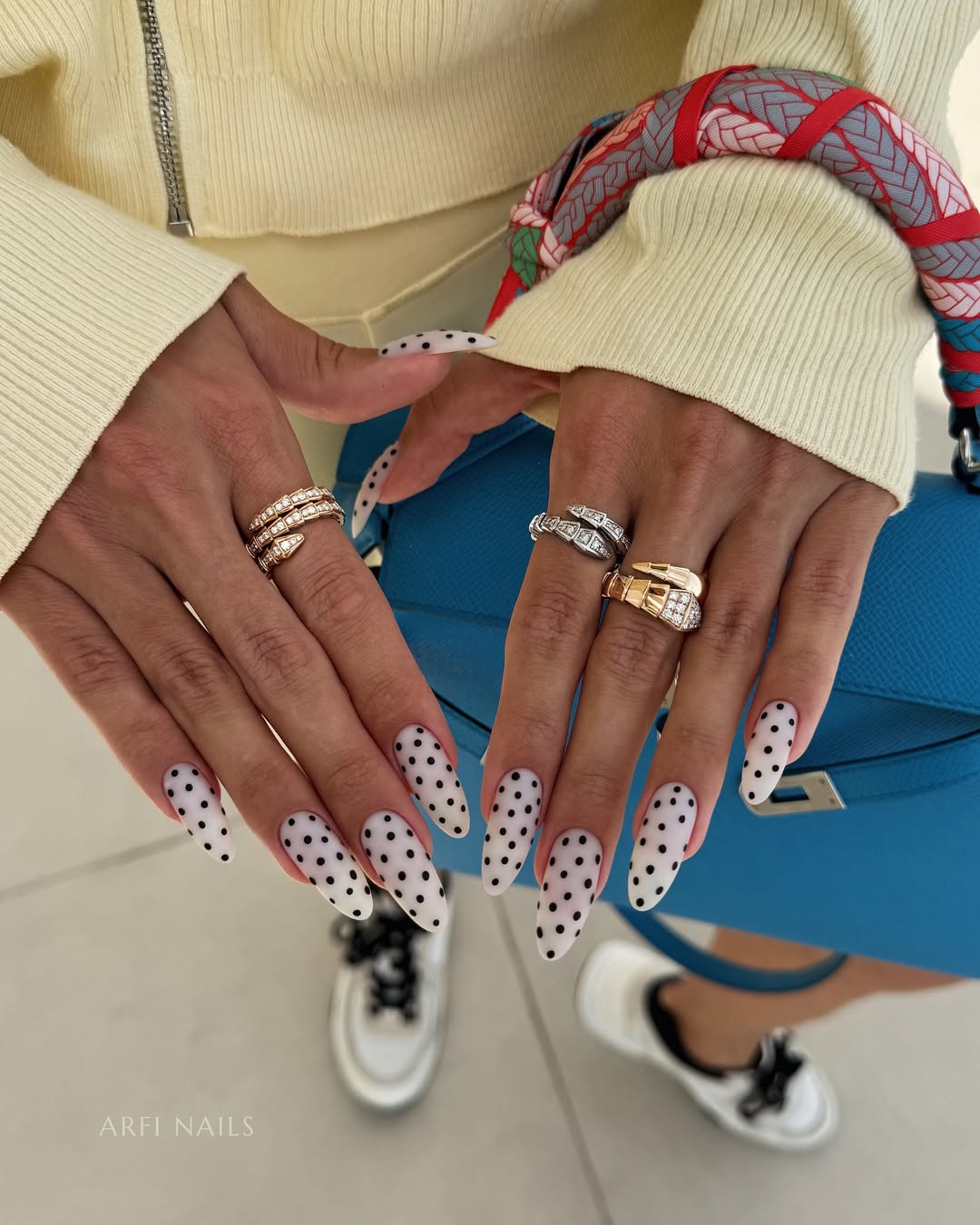 Das Punktemuster ist nicht nur in unserem Kleiderschrank ein absolutes Must-have, sondern jetzt auch auf unseren Nägeln! Polka Dot Nails sind zurück und sorgen mit ihrem verspielten Charme für einen echten Hingucker. Egal, ob in klassischen Schwarz-Weiß-Kombinationen oder mit herbstlichen Farbtönen wie tiefem Bordeaux oder warmem Senfgelb. Die Punkte auf den Nägeln bringen eine fröhliche Leichtigkeit in die herbstliche Stimmung.