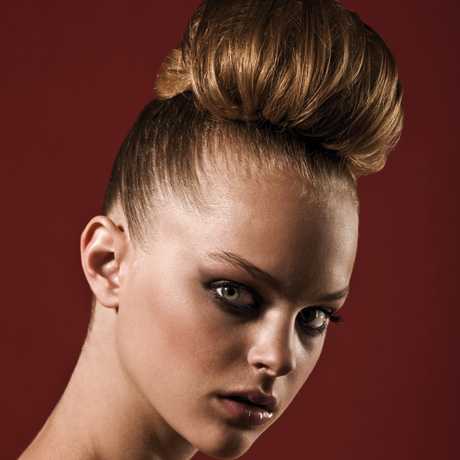 Einen hohen Zopf binden. Dann Strähne für Strähne des Zopfes fest toupieren. Mit viel Spray fixieren und den toupierten Teil mit einer weichen Bürste leicht frisieren.