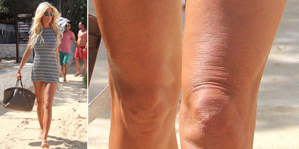 Dass an dem Körper von Victoria Silvstedt nicht mehr alles Natur ist, ist nicht Neues: überdimensionale Brüste und angespannte Gesichtsmimik legen den Verdacht nahe, dass der Beauty-Doc seine Finger im Spiel hatte. Da verwundert es doch, dass bei so viel Eitelkeit, die Oberschenkel der 39-jährigen etwas vernachlässigt wurden. Schaut man nämlich genauer hin, offenbart sich oberhalb des Knies eine faltige Dellen-Landschaft. Von der Tatsache, dass Victorias Beine etwas zu viel Sonne abbekommen haben - das Krebsrot lässt darauf schließen - mal ganz abgesehen. Die Optik ist eine unschöne.