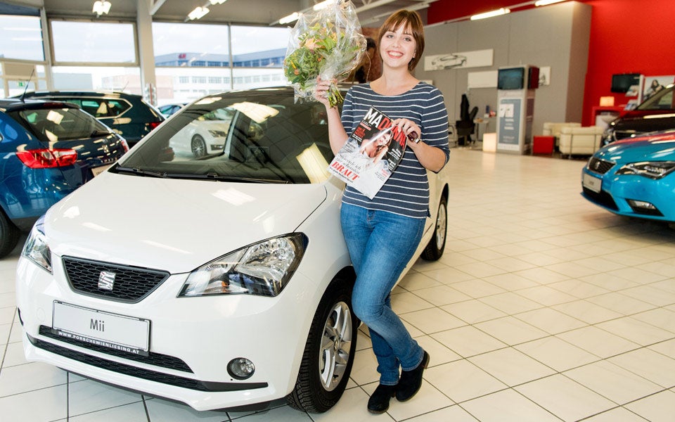 Es ist uns eine große Freude den tollen SEAT Mii an unsere treue MADONNA-Leserin Bettina überreichen zu können. Sie ist die glückliche Gewinnerin des großen SEAT Mii-Gewinnspiels mit Porsche Wien Liesing. Die 28-Jährige Wienerin hat uns mit ihrer liebevollen Einsendung ganz besonders überzeugt, denn für sie ist der spanische Cityflitzer ein wirklich großer Segen.