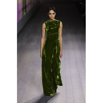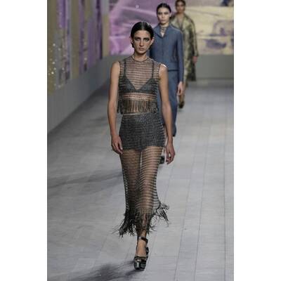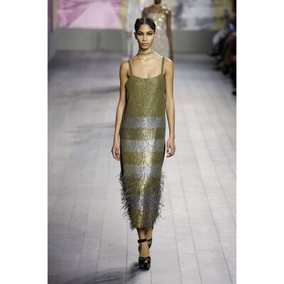 Für die Kollektion wählte Chiuri einen zurückhaltenden Ansatz der beliebten 1920er Showgirl-Outfits. Flapper-Kleid inspirierte Roben mit perlenbesetzten Fransen, schmeichelnden Dessous, und als größter neuer Trend: Samt -Kleider, -Mäntel, und sogar -Schuhe.