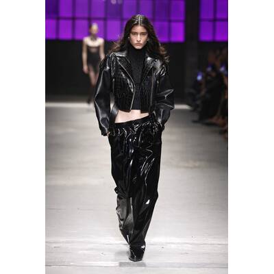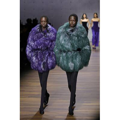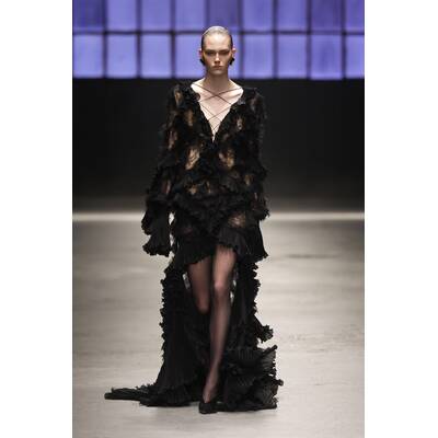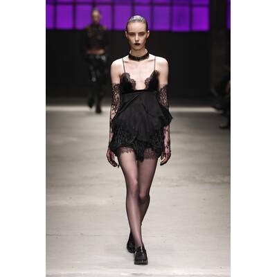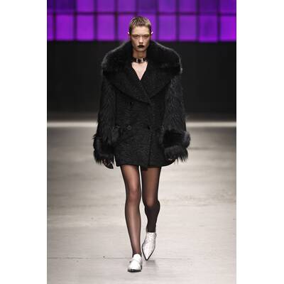 „Vielschichtiges Schwarz“ ist das neue Motto. Wir sahen transparente Spitzenbodys, die auf dramatische Feder-Röcke trafen. Fransen und XXL-Pelzmäntel über ultra-knappen Bralettes sorgten für puren Glamour und eine ordentliche Portion Drama.