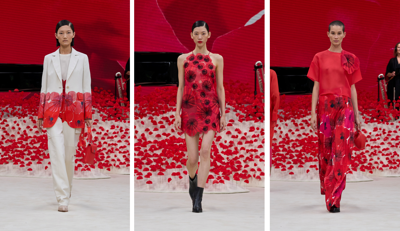 Der Trend kommt direkt von den Laufstegen: Das Mohnblumenkleid eröffnete im Oktober die Fashion Show von Akris im Pavillon Gabriel in Paris, begleitet von einem Meer aus papierenen Mohnblumen als Kulisse. Es ist zweifellos das Highlight der Kollektion: Ein Minikleid, das scheinbar nur aus roten Mohnblumen besteht, von Hand auf Tüll appliziert, jede einzelne in St. Gallen aus Seiden-Organza gestickt.
