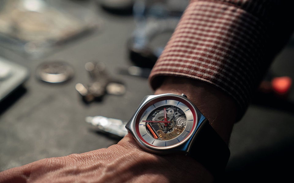 Die Swatch „Q“ entstand in enger Zusammenarbeit mit Suttirat Anne Larlarb, der Kostümbildnerin von "Keine Zeit Zu Sterben". Das Design entspricht Q's Stil und verkörpert einen Mix aus Tradition und Innovation. Ein braunes Lederarmband im Tartan-Karomuster, rote Ränder und ein Zifferblatt mit Sonnenschliff, welches den Uhrmechanismus dahinter offenbart, ergeben einen stimmigen, anglophilen Look. Sammler werden sich auch über die Box im Retro-Look freuen, welche als VHS-Kassette im Regal Agenten-Feeling aufkommen lässt.