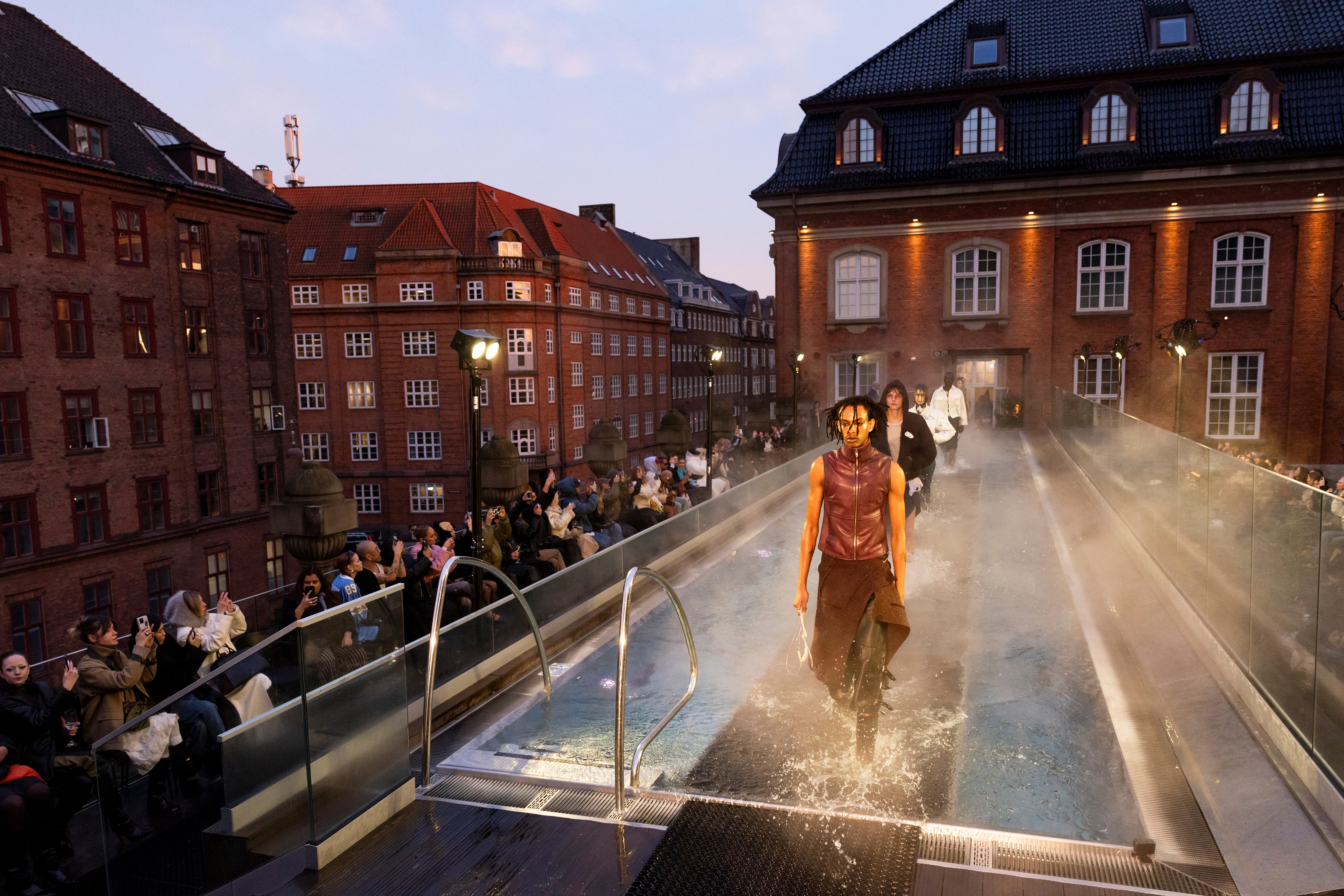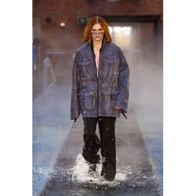 Deadwood verkörpert eine rebellische Ästhetik mit nachhaltigem Anspruch. Die Herbst/Winter-’25-Kollektion der schwedischen Marke taucht in die Tiefen des Ozeans ein – inspiriert von Sirenen, Piraten und unerforschten Meeren. Wettergegerbte Lederjacken und zerrissene Denim-Teile treffen auf die Spannung zwischen harten Materialien wie Denim und Wolle sowie sanften Korallen-Samtstoffen und romantischen Korsett-Details. Die Models liefen über das Pooldeck der Villa Copenhagen mit zerzaustem Haar und verwischtem Make-up, als wären sie gerade dem Wasser entstiegen.