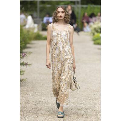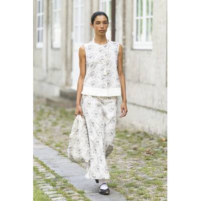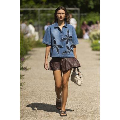 Munthe setzt mit der neuen Frühjahr/Sommer-Kollektion ein bewusstes Zeichen gegen die zunehmende Automatisierung in der Modewelt – mit einer Linie, die buchstäblich aus dem eigenen Garten stammt. Kreativdirektorin Naja Munthe sammelte mit ihrem Team Blätter und Blumen, presste sie von Hand in Stoffe und ließ durch ein altes botanisches Färbeverfahren einzigartige, natürliche Muster entstehen. Das Ergebnis ist eine Kollektion, die das Handgemachte feiert: Robuste Workwear-Hosen, überarbeitete Denim-Silhouetten und gesteppte Lederteile bringen Alltagstauglichkeit. Cleane Schnitte, wiederkehrende Outfit-Formeln und eine bewusste Struktur schaffen Ruhe inmitten des oft überladenen Modebetriebs. Accessoires wie blumenbedruckte Taschen, farblich abgestimmte Sandalen und auffällige Fußketten formen ein stimmiges Gesamtbild.