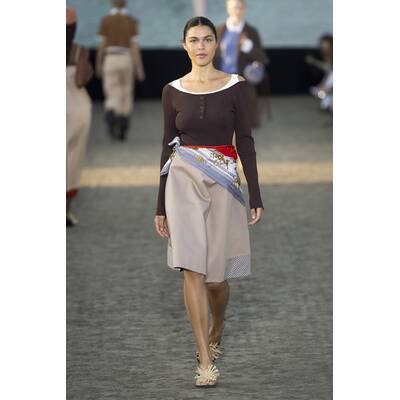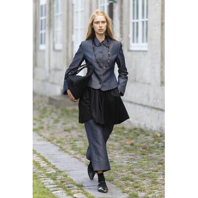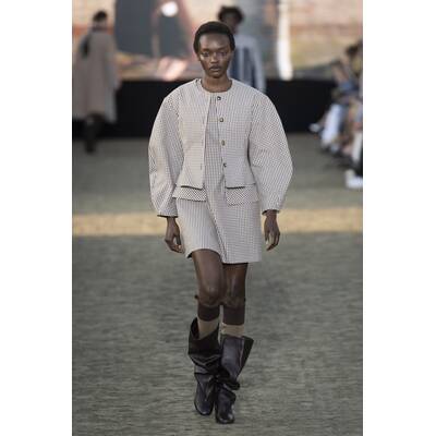 Für die Frühjahr/Sommer 2026-Kollektion entführt Baum und Pferdgarten das Publikum in einen echten Pferdestall – passender könnte der Rahmen für eine Derby-inspirierte Kollektion kaum sein. Die Designerinnen Rikke Baumgarten und Helle Hestehave präsentierten eine moderne Interpretation von Reitsport und Rennbahn-Stil. Sportliche Track-Jackets in gedeckten Tönen, A-Linien-Röcke mit Fischgrätmuster und Reitjacken aus Fake-Wildleder treffen auf feminine Kleider mit zarten Rüschen und Schleifen. Anders als in früheren, bunt gemixten Kollektionen, überzeugt SS26 durch klare Linien und betontes Tailoring – eine elegante Weiterentwicklung des typisch verspielten Stils des Labels.