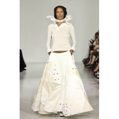 Nach fünf Jahren feiert das schwedische Upcycling-Label Rave Review sein Comeback auf der Copenhagen Fashion Week. Für die S/S-26-Kollektion setzt das Designerduo Josephine Bergqvist und Livia Schück auf klare Silhouetten, subtile Patchwork-Details und sorgfältig ausgewählte Deadstock-Stoffe aus Italien. Die Looks überzeugen durch voluminöse Schnitte mit abgerundeten Schultern und Hüften, die durch Boning geformt werden. Besonderes Augenmerk liegt auf upgecycelter Bettwäsche, die bewusst zerknittert wirkt. Farblich dominiert eine sanfte Pastellpalette mit zarten floralen Mustern.