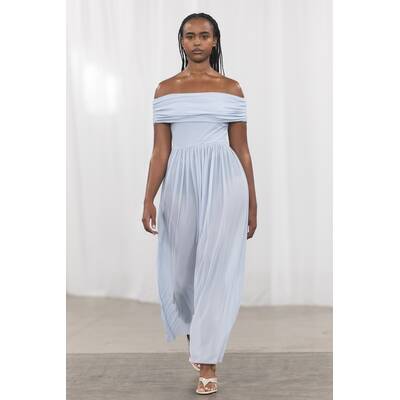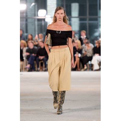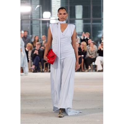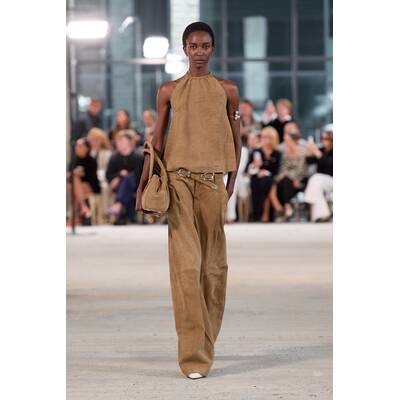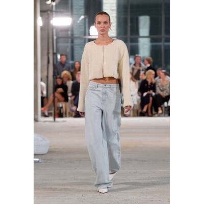 Das dänische It-Girl-Label taucht in die lässig-romantische Welt der 70er-Jahre ein – mit einer Kollektion, die zarter, transparenter und dennoch typisch Rotate ist. Für Früjhar/Sommer 2026 setzt die Brand auf gezielte Boho-Elemente: fließende Chiffonkleider in Pastell, zarte Volants und Pilotenbrillen. Jeans in flatternder Bootcut-Form und leichte Satin- oder Chiffonkleider unterstreichen die feminine Leichtigkeit.