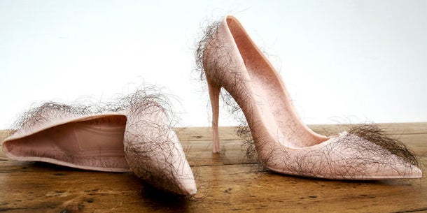 Wir hoffen sie haben heute schon gefrühstückt: Dieser Anblick dreht einem nämlich den Magen um. Die chinesische Künstlerin Zhu Tian hat High Heels aus Silikon und menschlichem Haar angefertigt - und zwar in mühsamer Handarbeit. Das abstoßende Objekt soll die sexuelle Aufladung von hohen Schuhen veranschaulichen - eine Umkehrung des Begehrenswerten ins Schauderhafte.