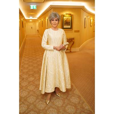 Stargast des Abends Jane Fonda in einer weißen Brokat-Leihrobe.