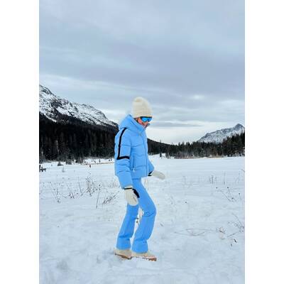 Caro Daur macht’s klassisch: In ihrer schwarzen Kombi mit schicker Fellkapuze und Taillengürtel könnte sie genauso gut einen Agenten-Thriller drehen wie elegant die Piste runtercarven. Funktional, zeitlos – und gleichzeitig so glamourös, dass der Après-Ski quasi eingebaut ist.