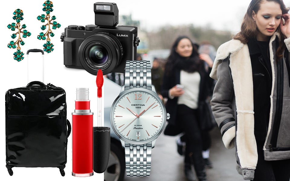 Im Uhrzeigersinn: Oscar De La Renta Crystal Branch Ohrringe (um 259,00 Euro) über Cadenzza, Panasonic LUMIX 100 Premium Digitalkamera (ca. 630,00 Euro), Certina DS Dream Lady um (415,00 Euro), MAC Retro Matte Liquid Lipcolour in der Nuance Fashion Legacy um (25,50 Euro) und der schicke Plume Vinyle Koffer von Lipault (199 Euro).