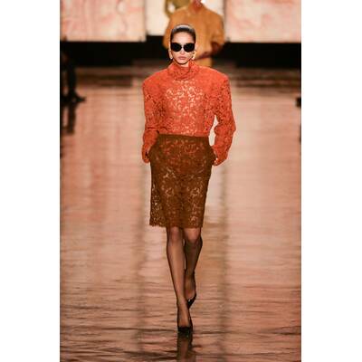 Anthony Vaccarello, der Kreativdirektor von Saint Laurent, präsentierte eine Kollektion, die sich durch kraftvolle Silhouetten und Farben auszeichnete. Spitze, Leo-Muster und florale Details setzten unerwartete Kontraste.