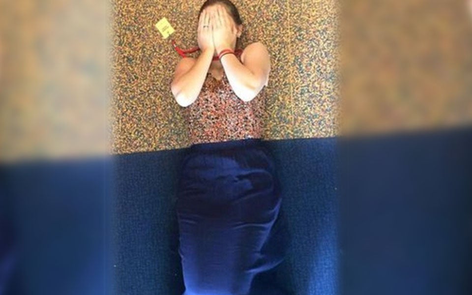 Aber jetzt stellen Sie sich mal vor, sie gehen zu einem Event und stellen fest, dass ihr Look exakt dem Teppich im Veranstaltungsort gleicht! Ahhhhh! Gibt es nicht? Gibt es wohl! Genau das ist dieser Frau passiert. Zum Beweis legte sie sich auf den Boden und machte ein Foto. Unter das Bild schreibt sie: „Ich bin in den Raum gelaufen und habe gemerkt, dass der Teppich das gleiche Outfit gewählt hat.“