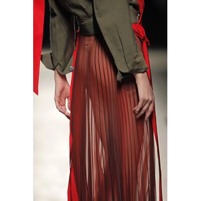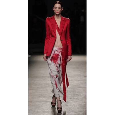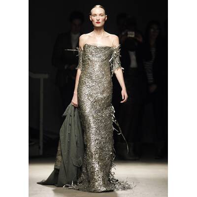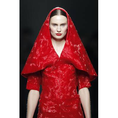 Dramatisch und blutrot waren am Vorabend die insgesamt fünftägigen Couture-Schauen gestartet. Designer Josephus Thimister hatte sich in seiner ersten Kollektion nach jahrelanger Laufsteg-Abstinenz vom grausamen Ersten Weltkrieg inspirieren lassen. Dabei ließ er aus dem Horror vollkommene Schönheit wachsen. Über klar geschnittenen Abendkleidern flocht sich in Streifen geschnittene Silberfolie. In hellem Leuchtrot schillerten mit Pailletten bestickte Cocktailkleider. Röcke kombinierte Thimister zu Militärjacken, bei denen deutsche Flaggenabzeichen auf den Ärmeln wie kurz vor der Schau übermalt wirkten.