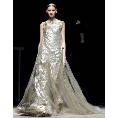 "Tess war auch ein Vorbild", sagte Josse nach dem Defilee, und so erinnerte die märchenhafte Braut am Ende der Show an die Romanheldin von Thomas Hardy aus dem Jahr 1891. Sie kam im Kleid mit einem T-Shirt-Oberteil aus Tüll zum Schleppenrock mit aufgesetzten Federn.