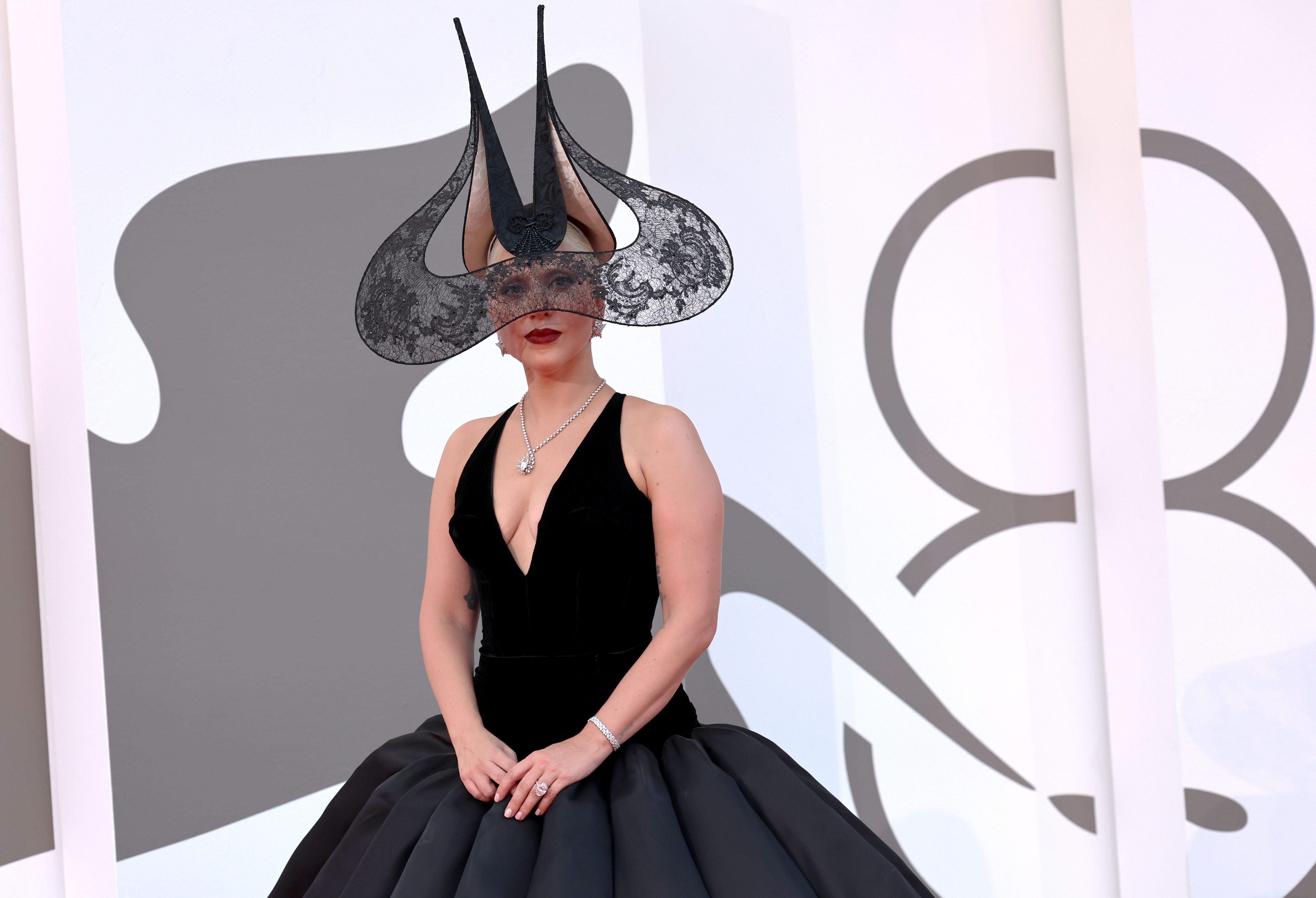 Wenige Stunden später schlüpfte Lady Gaga dann in einen extravaganteren Look. Das schwarze Haute Couture Kleid von Dior bestand aus einem tief ausgeschnittenen Samtoberteil und einem voluminösen Rock, der sich dramatisch und ihre Beine bauschte. Ein besonderer Hingucker war allerdings der auffallende Kopfschmuck: Eine Skulptur aus Spitze, die ihre Augen bedeckte und sich am Kopf zu zwei Spitzen formte, erinnerte an surrealistische Hörner.