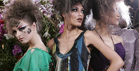 Wilde auftoupierte Haare, farbig geschminkte Augenbrauen, smooky Eyes und in die Gesichter gemalte Blumen machten die Models, die in trashig glamourösen Roben und umgeben von lebenden Blumen den Laufsteg bevölkerten, zu Ikonen der Freiheit in einer neuen Hippie-Punk Ära. Wir haben die Bilder! Klicken Sie durch!